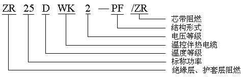 例如:15DXW-J 即:低温基本型,10℃时每米输出功率为15W,工作电压为220V。 ZR25DWK3-PF 即:阻燃低温屏蔽防护型,10℃时每米输出功率为25W,工作电压为380V,具有阻燃、防爆、防护性能。