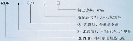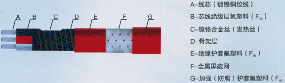 三根平行绝缘铜绞线为电源母线,在内护套绝缘层上缠绕电热丝,并将电热丝每隔一定距离(即“发热切长”)分别依次与电源母线AB—BC—CA—AB……反复循环连接,在每二相间形成连续并联电阻。当母线通以三相电后,各并联电阻同时发热,因而形成一条连续三相供电的加热带。