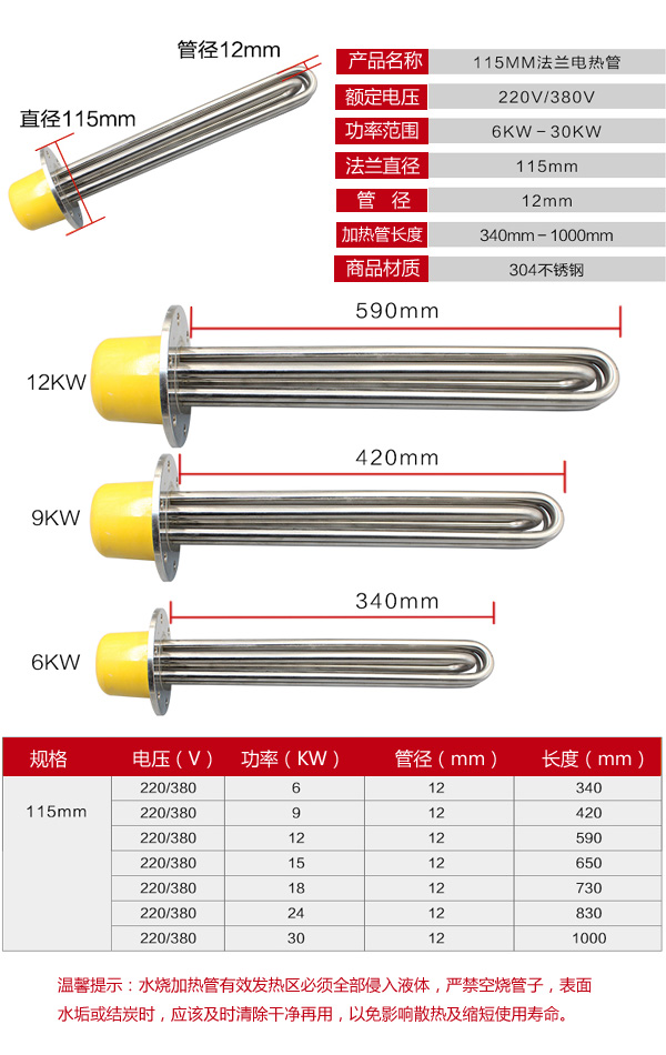 使用优质厚壁无缝不锈钢管、美国进口高温氧化镁粉及封口材料,使耐温达900℃,在暂时脱水状态下干烧不会损坏。
