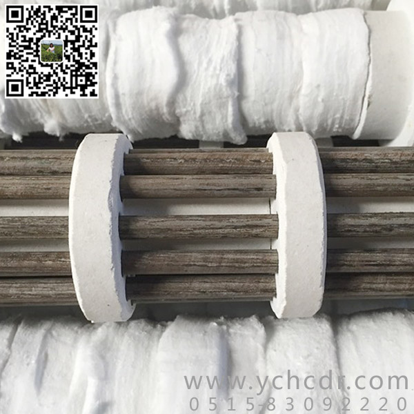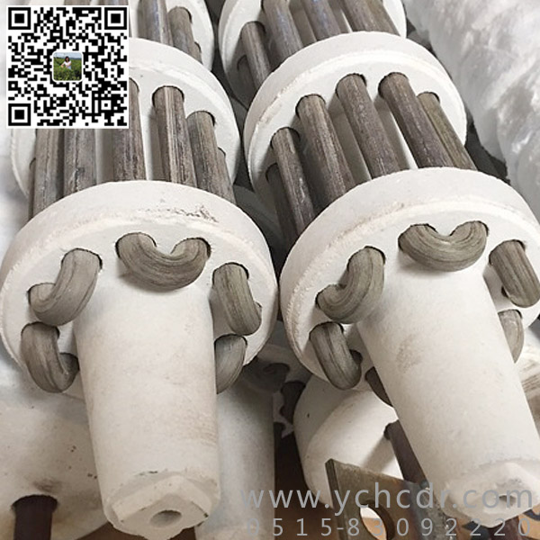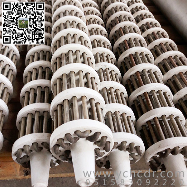 其结构是将加热元件的电阻丝(带)弯成“U”形串入多块绝缘耐高温的陶瓷支撑盘中,中间用一根耐热棒固定,一般有效长度:900~2400;一般套管外径:φ80~φ280。单根功率:2kw~40kw;单根电压:30v~220v。这种辐射管寿命较长。